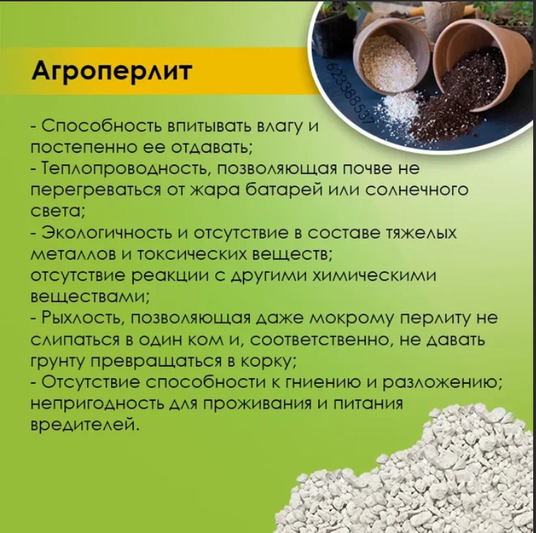 Экологически безопасная добавка, которая поможет сделать почву более рыхлой и воздухопроницаемой способствуя развитию мощной и здоровой корневой системы ваших растений. Впитывает жидкость в 3-4 раза больше своей массы. Создает оптимальную воздушно-влажную среду для развития растений. Агроперлит используется: - в комнатном цветоводстве, для выращивания рассады овощных и цветочных культур в составе земельных смесей (например, с торфом, мхом сфагнумом, песком) в различных соотношениях; - для проращивания семян и укоренения черенков (метод гидропоники); - для мульчирования поверхности грунта, с целью защиты от пересыхания, перегрева, растрескивания; - в качестве дренажа - на дно горшка или контейнера насыпать 3-5 см влажного агроперлита; - в качестве добавки для приготовления субстратов в агропромышленном комплексе, создания контейнеров на основе торфа и сорбентов в технологии капельного полива в закрытых грунтах. Агроперлит абсолютно инертен, не содержит химически активных и вредных элементов.