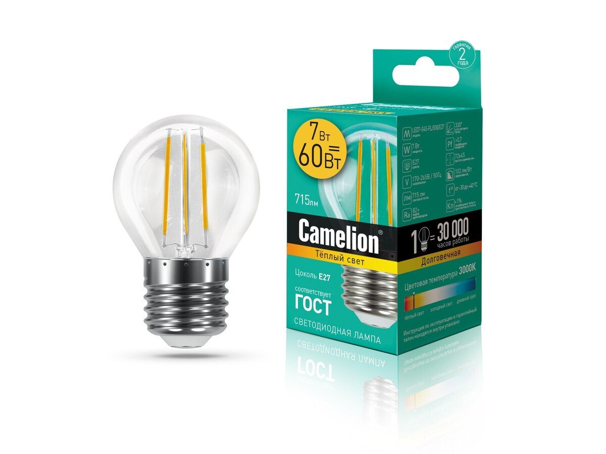 Лампа светодиодная LED Camelion Filament Е27 7Вт G45 шар 3000K теплый свет 13457