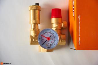 Группа безопасности устанавливается на напольных котлах для контроля за давлением в системе и для сброса лишнего воздуха. Воздухоотводчик сбрасывает лишний воздух в автоматическом режиме. Рекомендуется закрыть черную крышку воздухоотводчика после пуско-наладки котла.Группа безопасности также содержит предохранительный клапан, который сливает воду, если давление превышает значение 3 бар, защищая, таким образом, компоненты системы от повышенного давления.