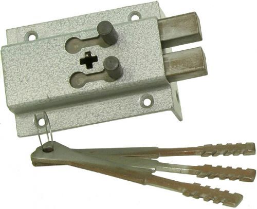 Замок накладной реечный Делга-КОМАЗ-ПХК. С прямым ходом ключа. Два прямоугольных ригеля с ходом 22 мм. Замок может монтироваться в правые и левые двери толщиной до 45 мм. Замок открывается на прямом ходе ключа. Рекомендован для установки на металлические двери гаражей, подъездов или других дверей общественного пользования. Длина ключа 10 см.