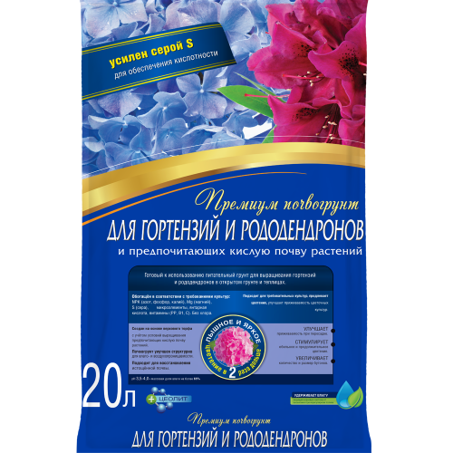 Готовый к использованию специальный грунт отлично подходит для выращивания гортензий (крупнолистных, древовидных, метельчатых, черешковых, дуболистных и др.) и рододендронов в открытом грунте и теплицах.