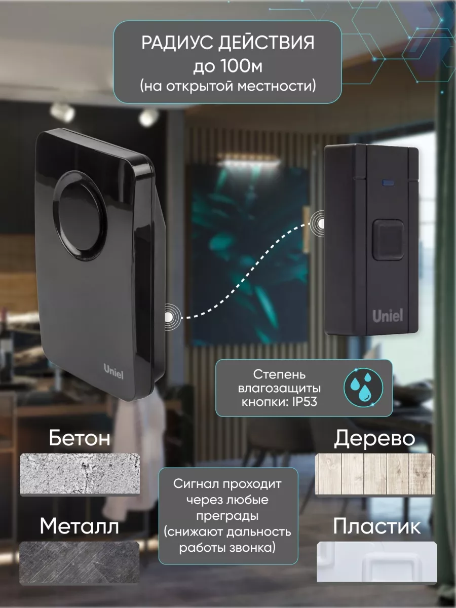Электронный дверной звонок бренда Юниэль предназначен для бытового использования и служит для оповещения о посетителях посредством звукового сигнала. Главная особенность беспроводного дверного звонка состоит в том, что его не нужно подключать к электросети и не нужно связывать проводами кнопку и сам звонок. Когда вы нажимаете на кнопку вызова, встроенный в нее передатчик посылает сигнал определенной частоты. Этот сигнал принимает основной блок дверного звонка, который содержит приемник, настроенный на аналогичную частоту, при этом включается динамик, из которого раздается мелодия звонка, доступно 36 мелодии на выбор. Дистанция приёма-передачи сигнала между звонком и кнопкой звонка составляет 100 м на открытом пространстве. Электронный беспроводной дверной звонок работает от трех батареек типоразмера АА (в комплект не входят). Питание кнопки происходит посредством батарейки типоразмера А23 (поставляется с прибором). Кнопка звонка имеют защиту от водных брызг и пыли (IP53).