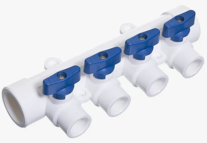 Коллектор полипропиленовый 32х20 3 выхода с шаровыми кранами синий