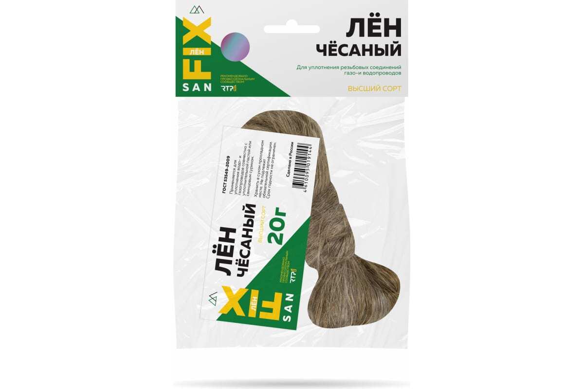 Сантехнический лен SANFIX – натуральный, очищенный продукт, получаемый из однородного по структуре, тонкого, чесаного льна. Благодаря качественной очистке материал не дает отходов при использовании, не закручивается и не сбивается.