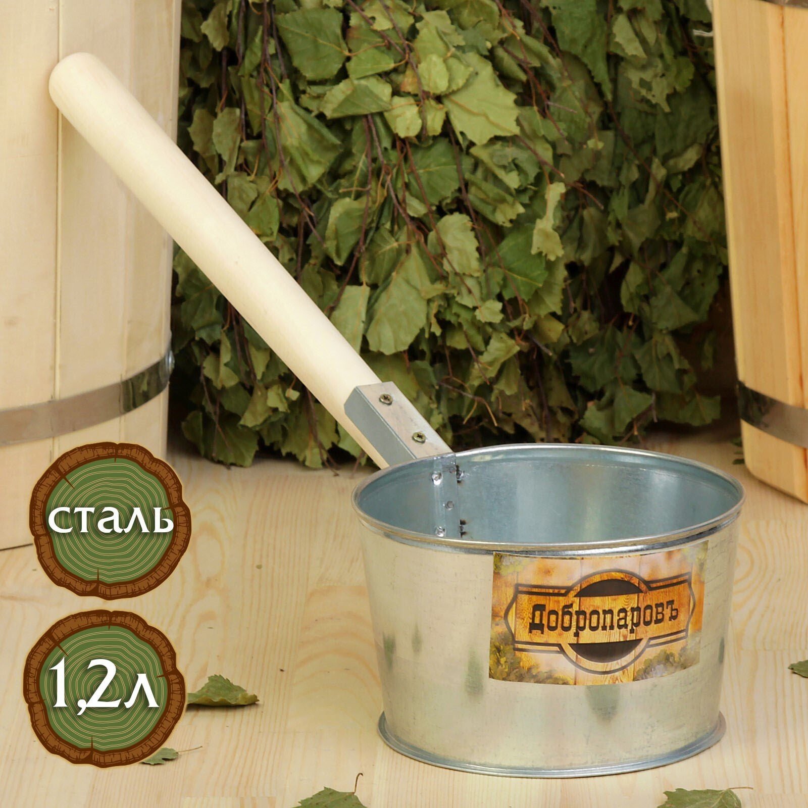 Ковш для бани 1.2л 45см из оцинкованной стали с деревянной ручкой Добропаровъ