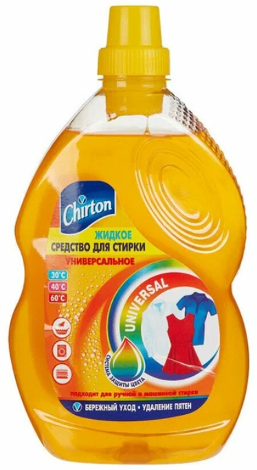 Средство для стирки универсальное ChirtonНазначение: Универсальное синтетическое моющее средство предназначено для ручной и машинной стирки различных изделий из белых и цветных синтетических и натуральных тканей. Хорошо растворяется в воде и великолепно отстирывает самые различные загрязнения. Отлично сохраняет фактуру тканей и насыщенность цветов даже после частых стирок. Придаёт тканям свежесть и приятный аромат. Подходит для стирки всех видов тканей различного цвета. Способ применения: Рекомендуется использовать колпачок от бутылки со средством для стирки. — Ручная стирка: Развести 80 мл (2 колпачка) средства для стирки в 10 литрах чистой воды. В полученном растворе стираемые изделия следует замочить на 30 минут, потом постирать и прополоскать в чистой воде. — Машинная стирка: Залить средство для стирки в соответствующий отсек стиральной машины из расчёта 80 мл (2 колпачка) средства на 4-5 кг стираемых изделий и осуществить стирку изделий в стиральной машине в соответствии с инструкцией к стиральной машине. ВНИМАНИЕ! Рекомендуемая температура воды для стирки со средством: от +30°C до +60°C. При стирке сильнозагрязнённых изделий или при стирке в жёсткой воде указанные дозировки рекомендуется увеличить в 1.5-2 раза (до 120-160 мл). Машинная стирка предполагает стирку в автоматической стиральной машине бытового назначения.