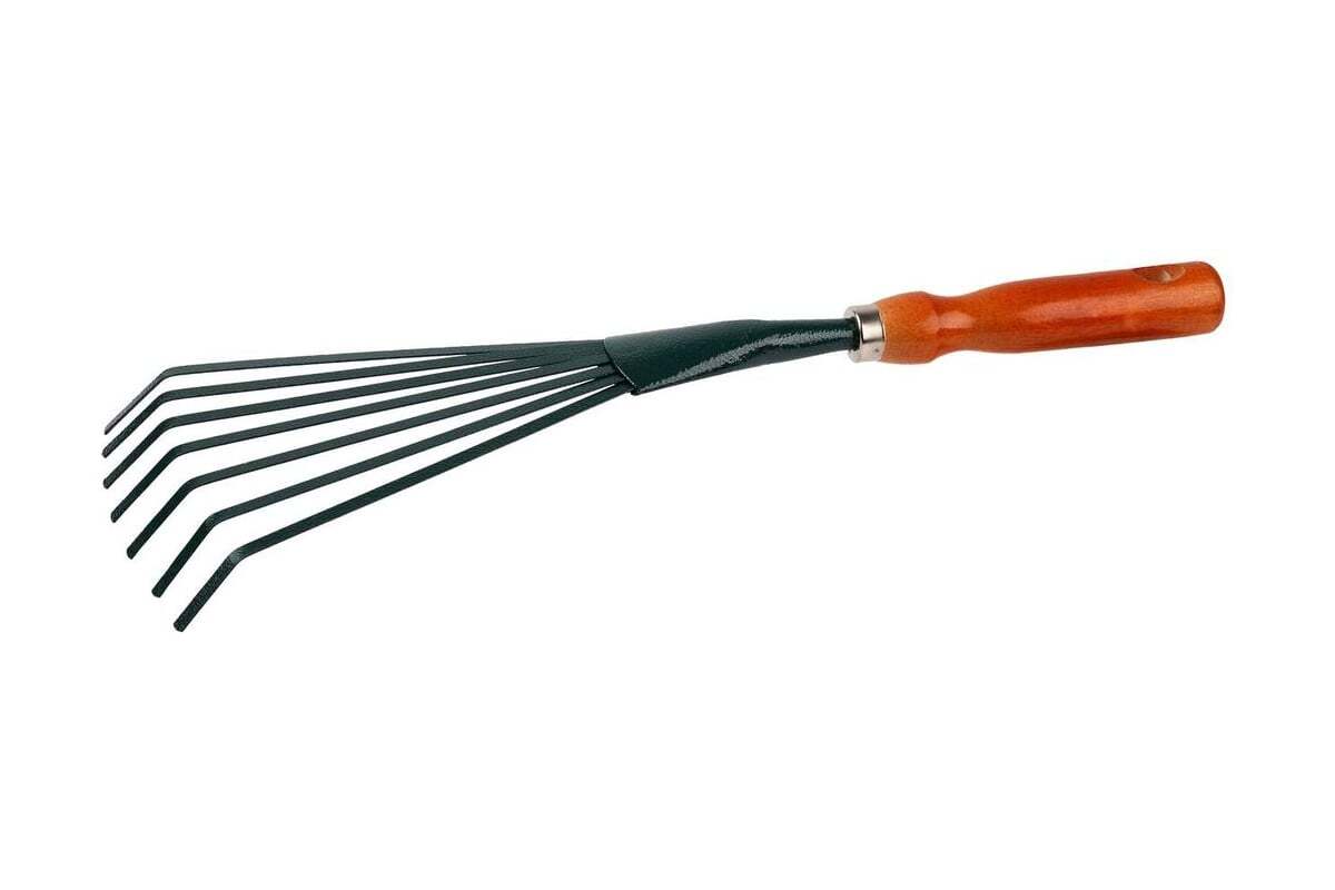 Веерные грабельки 390мм Grinda 8-421253_z01 предназначены для сбора листвы или аэрации почвы на садовом участке или в огороде. Грабли оснащены семью плоскими зубьями, которые изготовлены из высококачественной стали с покрытием "Hammertone". Эргономичная деревянная рукоять не скользит в руке и оснащена отверстием для подвешивания инструмента после использования.