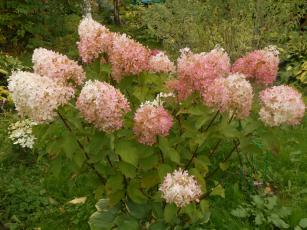 Среди метельчатых гортензий у этого сорта самые большие конические соцветия, при распускании они светло-кремовые, затем изменяются до слегка розовых, цветение обильное в июле-сентябре, куст выносливый, высотой 200 см, с длинными ветвями, требует солнечного места и влажной почвы.