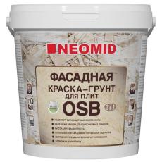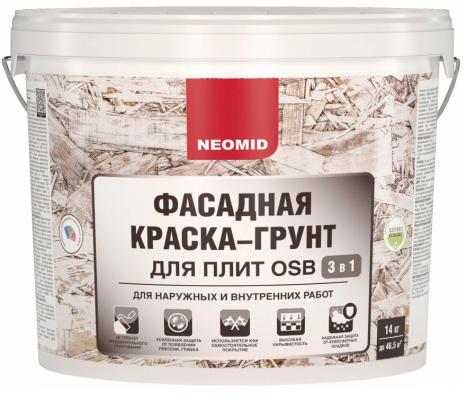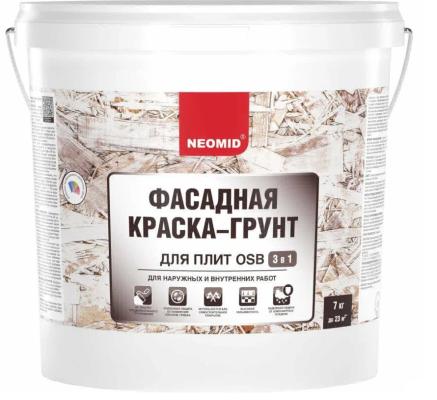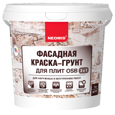 Фасадная краска-грунт для плит OSB NEOMID "3 в 1" совмещает в себе фасадную краску, грунтовочное покрытие и биозащиту – предназначена для финишной декоративной окраски ориентированно-стружечных плит, а также для защиты от атмосферного воздействия, перепадов температур, влаги, УФ-излучения и биологического воздействия: грибка, плесени и гниения.