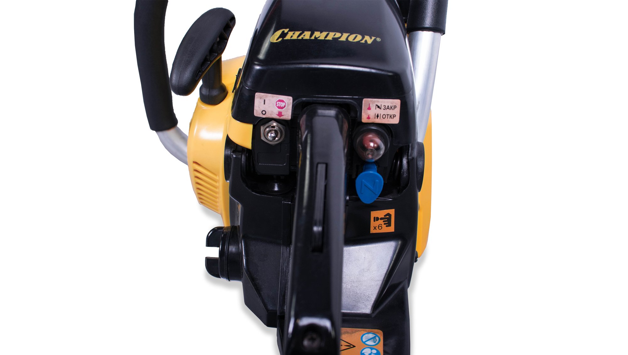 Инструмент оборудован уловителем цепи, рычагом тормоза, цепью с низкой отдачей и блокиратором курка газа, что повышает безопасность использования.
