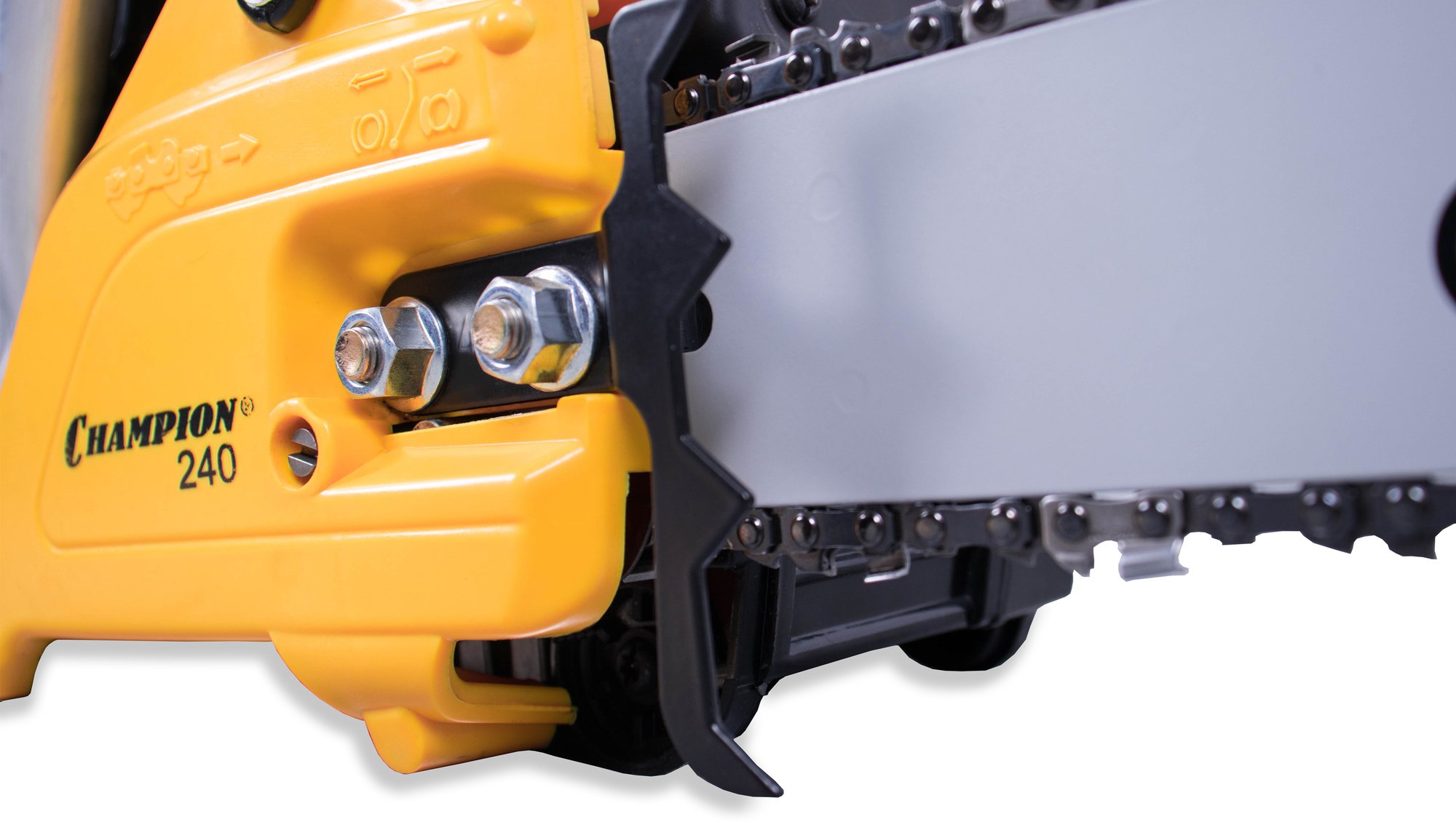 - Тормоз цепи останавливает ее вращение в случае отсткока, снижая вероятность травмы во время работы.