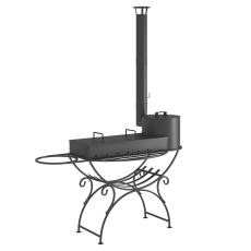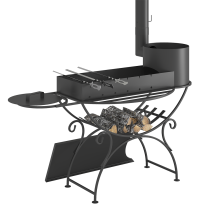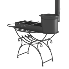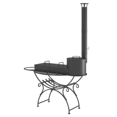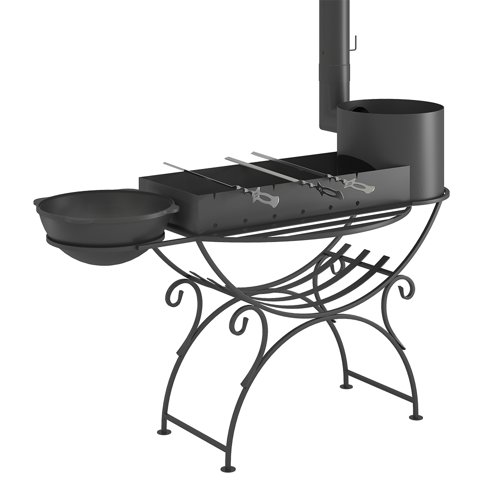Мангал установлен на лёгких стальных ножках с коваными элементами. Ножки образуют под коробом мангала полку для хранения топлива.