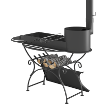 С противоположной от подказанника стороны короба мангала закреплён столик круглой формы для размещения посуды или аксессуаров по уходу за мангалом.