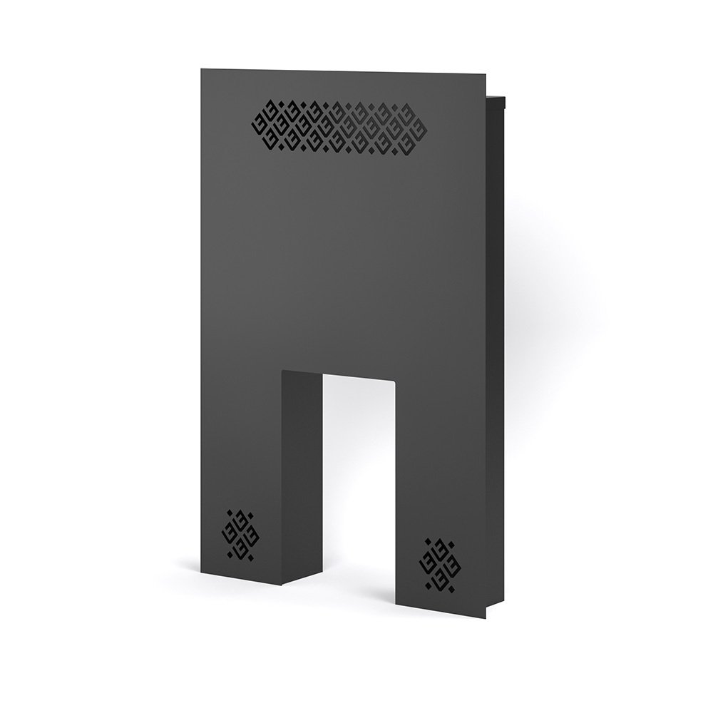 Фронтальный защитный экран сделан в виде П-образной арки, которая обрамляет топочную дверку и топочный тоннель печи. Передняя панель экрана имеет толщину 2 миллиметра, остальные элементы – толщиной 1 миллиметр. Небольшой борт по периметру передней панели позволяет красиво отделать экран и скрыть швы между экраном и стеной.