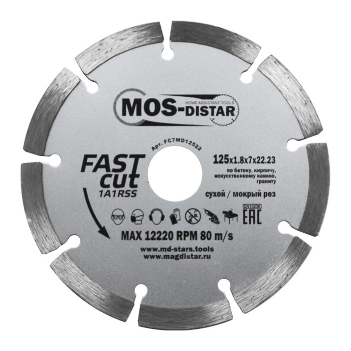 Диск алмазный 1A1RSS FAST CUT или БЫСТРЫЙ РЕЗ 230х2,4х7х22,23 от MOS-DISTAR – это сегментный диск, разработанный для обработки камня (искусственного или натурального). Он обладает высокой скоростью реза, рассчитан на оперативную обработку материала. За счет сегментного строения корпуса диск может работать без дополнительного охлаждения, не теряя при этом режущих свойств.