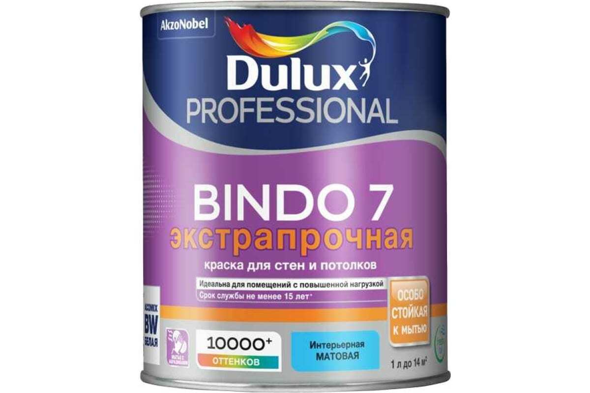Краска для стен и потолков DULUX BINDO 7 износостойкая, матовая, белая, база BW 2,5 л