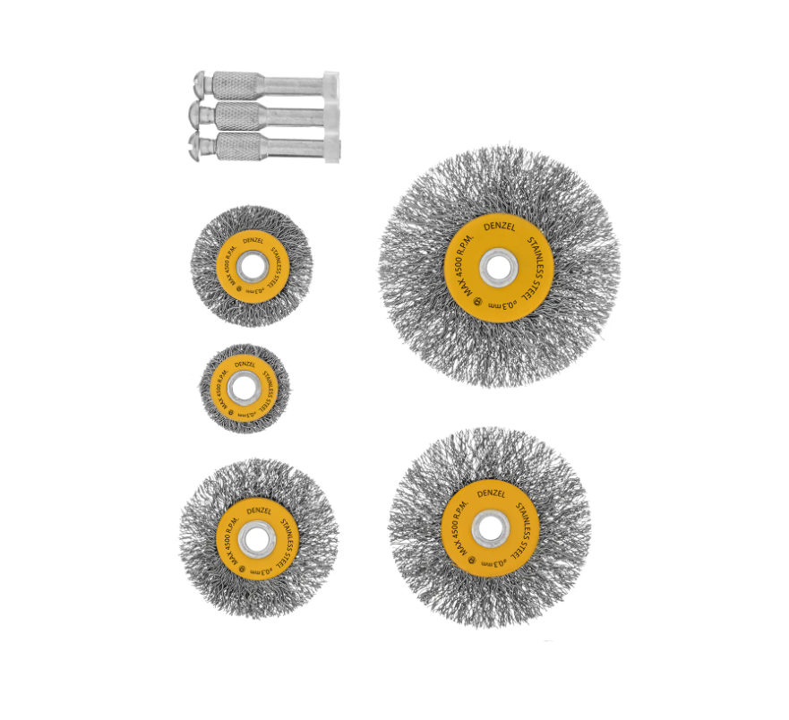 Набор щеток для дрели: Плоские 25-38-50-63-75мм шпилька, нерж. вит. проволока Denzel