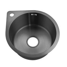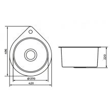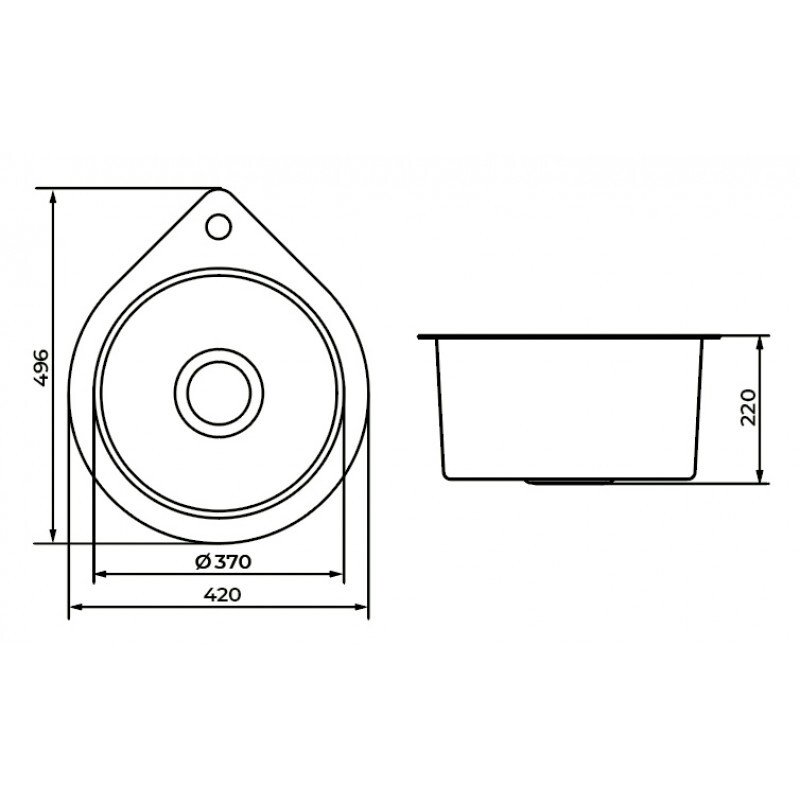 Кухонная мойка из премиальной нержавеющей стали 3 мм, врезного или подстольного монтажа, каплевидной формы 420*496 мм, с круглой чашей диаметром 370 мм, глубина чаши 220 мм.