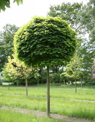 Дерево с небольшой плотной кроной, очень медленно растущее, достигающее 7 м в высоту и 4 м в ширину, без обрезки образует ровную, очень густую шаровидную крону, которая у взрослых деревьев принимает более плоскую форму. Листья супротивные, во время распускания красно-коричневые, позже яркие светло-зеленые, до 20 см в ширину, с пятью-семью лопастями, зубчатые, зимующие почки красные или красно-фиолетовые. Цветение Клена Глобозум происходит в мае желтовато-зелёными, душистыми цветками, в щитковидных соцветиях. Плоды – крупные коричневые двукрылки. Вызревают в сентябре. Светолюбив, но может расти и в полутени. К почве не требователен, но предпочитает плодородную, рыхлую, достаточно увлажнённую. Не выносит пересушенных почв, застойной влаги и засоленности. Саженцы с открытой корневой системой высаживают весной и осенью. Морозоустойчив, однако в морозные зимы могут повреждаться побеги. Высоко стоек к болезням и вредителям.