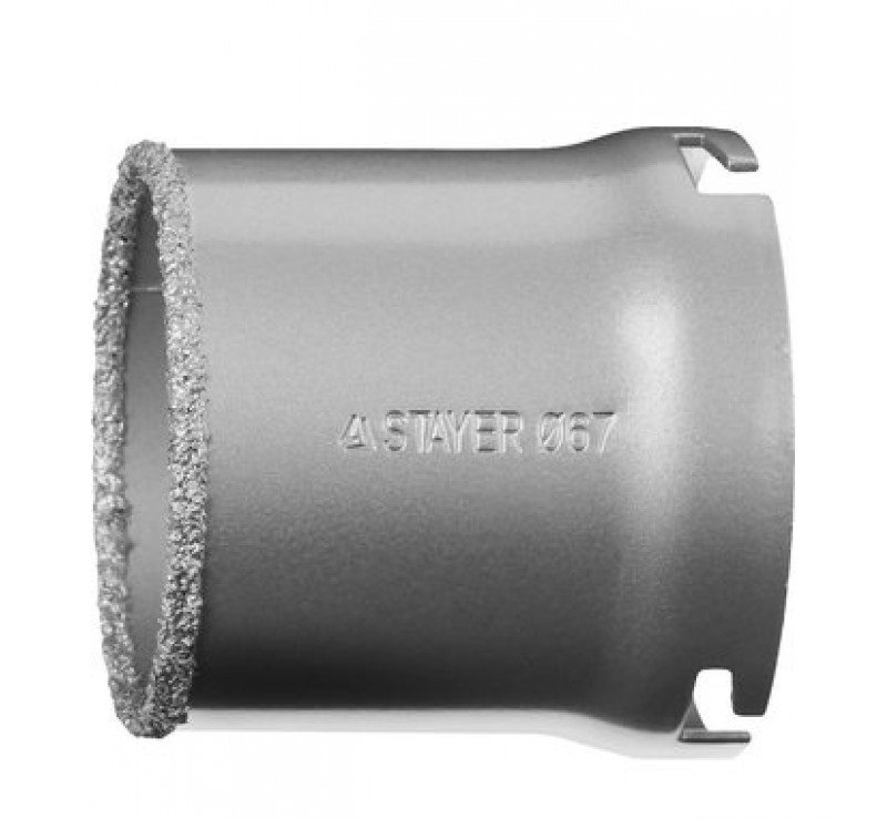 Коронка STAYER "PROFESSIONAL" кольцевая с карбидно-вольфрамовой крошкой, d=67мм. Система крепления: без державки, Диаметр: 6.7 см, Длина: 5.5 см. Буровая коронка с твердосплавным напылением STAYER 33345-67, применяется для получения ровных отверстий в облицовочных материалах, а также в ячеистом бетоне, кирпиче и гипсокартоне. Равномерное напыление твердосплавных режущих элементов обеспечивает аккуратное сверление материала без трещин и сколов. Новейшая технология автоматического напыления и высокотемпературной спайки твердосплавной крошки к корпусу. Надежная связка карбида вольфрама благодаря термической обработке в вакууме.