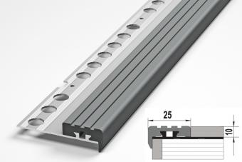 Алюминиевый внешний угол (накладка на ступень), 28.4 х 10.5 мм. Длина 2500 мм. C ПВХ накладкой на невидимой алюминиевой основе против скольжения и как элемент грязезащиты. Предназначен для защиты грани ступени. Устанавливается до момента укладки напольного покрытия на ступень, так как невидимая алюминиевая основа закладывается под напольное покрытие.
