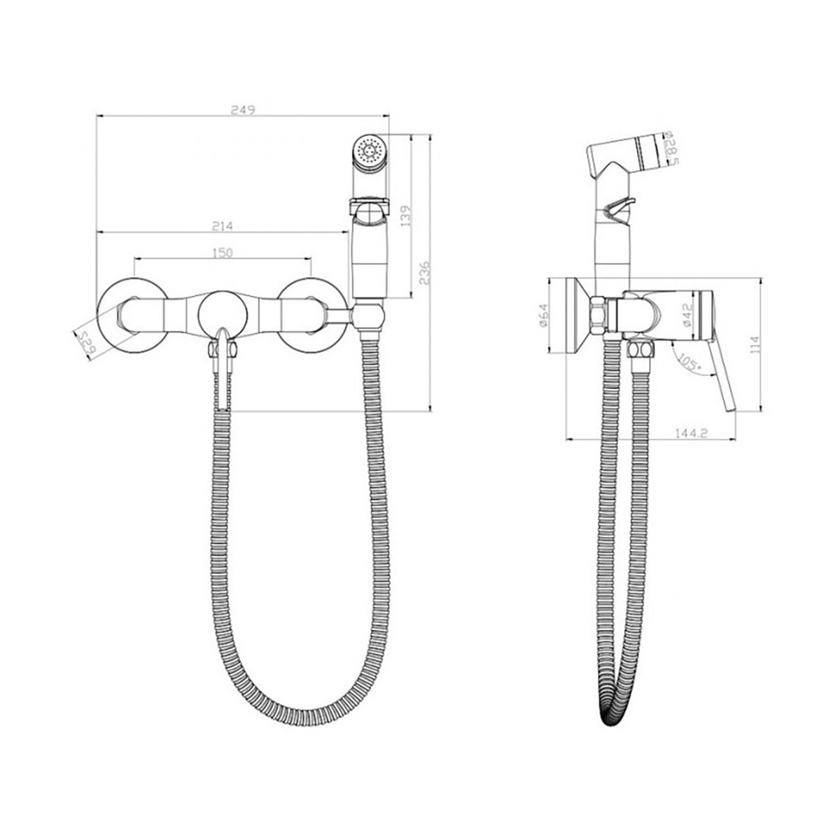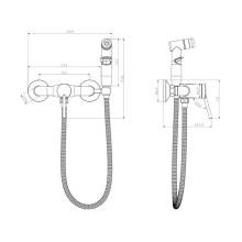 Современный смеситель с гигиеническим душем. Аксессуары в комплекте: лейка для биде с функцией плавной регулировки напора воды, шланг 1,5 м. Имеет 2 отверстия для монтажа.