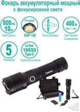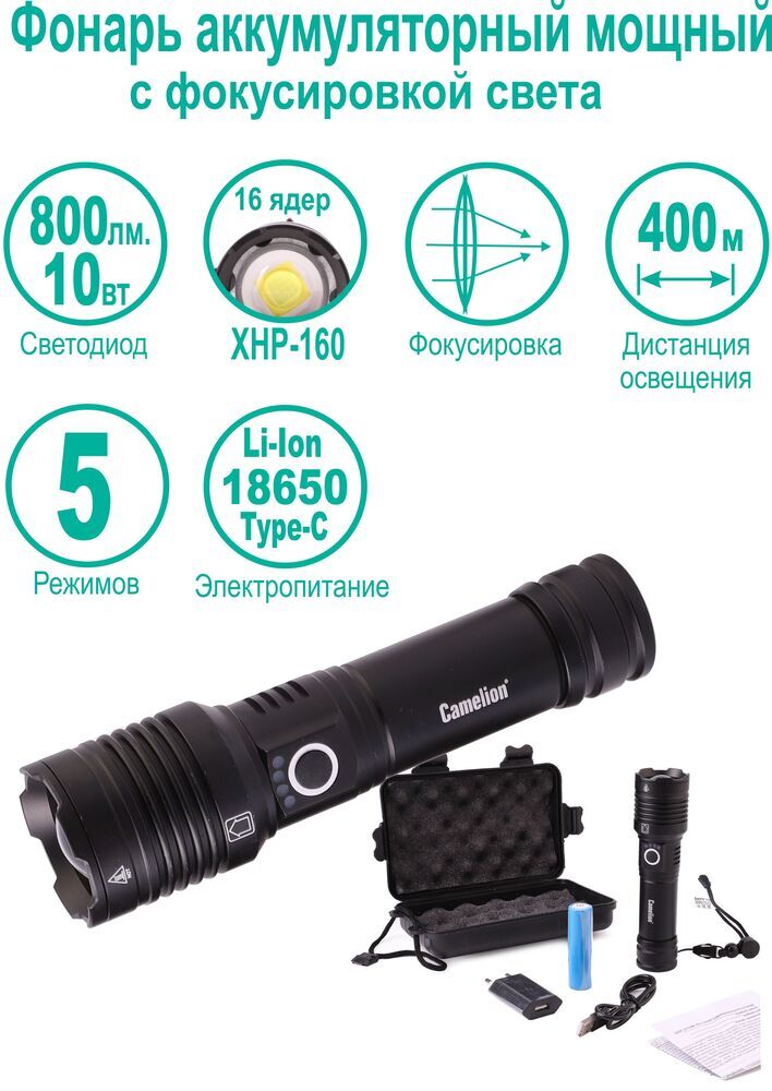 Источник света 16 – и ядерный светодиод XHP160. 5 режимов освещения. Фокусировка света (ZOOM). Заряд через Type C. Индикация окончания заряда / разряда. Возможность работы от Li-Ion аккумулятора типа 26650, от батареек 3 x LR03