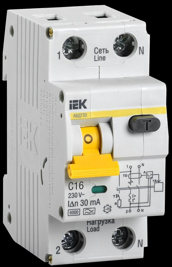 На корпусе дифференциального автоматического 1-полюсного выключателя IEK АВДТ-32 MAD22-5-016-C-30 предусмотрена кнопка ТЕСТ для проверки работоспособности устройства и правильности подключения.