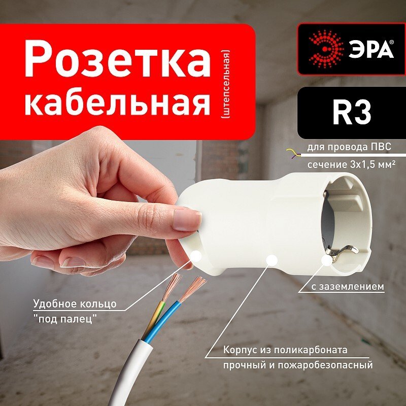 Розетка штепсельная ЭРА R3, c заземлением, максимальная мощность - 16A/3500Вт (кабель до 3x1,5мм2).