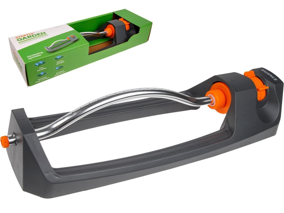 маятниковый осциллирующий распылитель применяются для стационарного полива растений при подключении к водопроводному шлангу с помощью стандартного штуцера для подключения быстросоединителей. Регулировка поворота осциллирующего блока обеспечивает равномерный полив прямоугольного участка заданной площади (слева, справа, центр, полная площадь). Алюминиевая трубка с 17 струйными форсунками