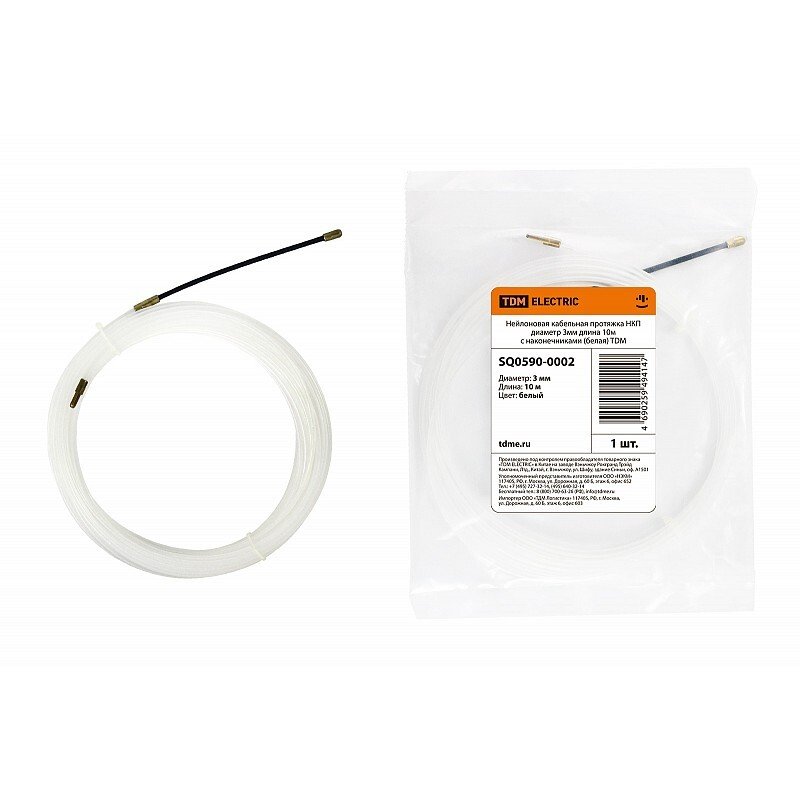 Протяжка оборудована комплектом запрессованных фиксированных наконечников: гибкая пружинная направляющая для проталкивания и заглушка-окно для протягивания кабеля. Индивидуальная упаковка. Пластичность и гибкость протяжки из нейлона.