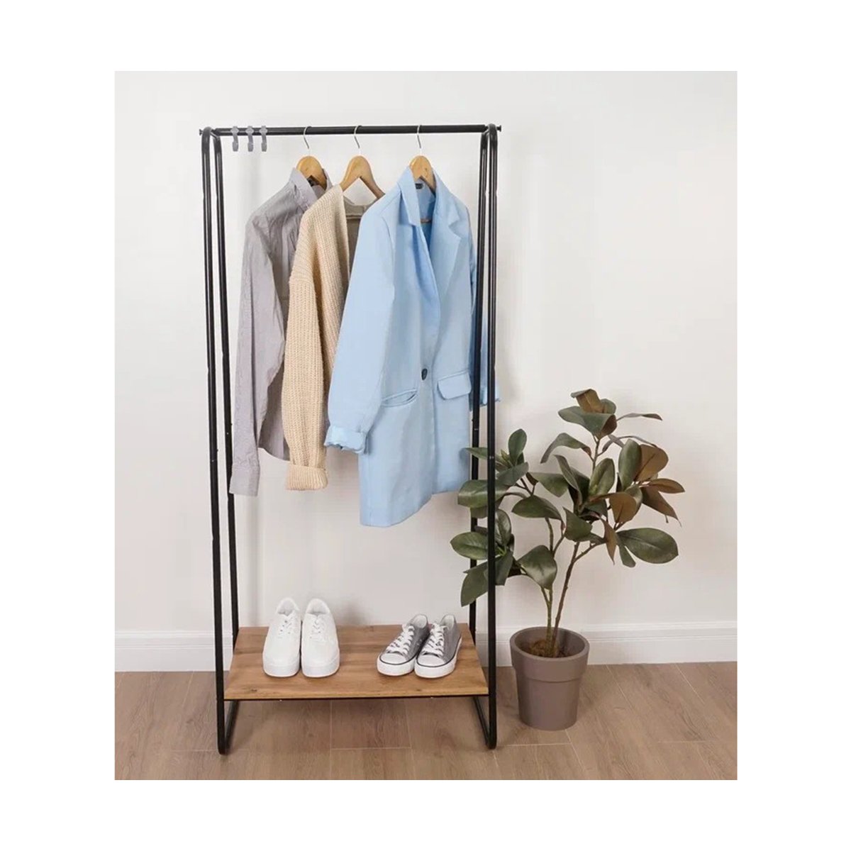 Стильная напольная вешалка для одежды удобно и рационально разместит вещи и станет украшением интерьера. Сочетание практичности и универсальности данной модели позволяет использовать вешалку как в спальне, так и в прихожей. Долговечная, благодаря каркасу из стали, покрытому полимерно-порошковым покрытием. Перекладина выдерживает нагрузку до 20 кг, а полка из высококачественного ЛДСП до 10 кг. Надежная металлическая конструкция позволит разместить до 10 плечиков c одеждой.