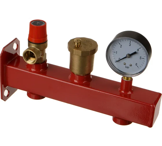 Группа безопасности для монтажа мембранного расширительного бака представляет собой смонтированные на полой консоли из оцинкованной стали красного цвета предохранительный клапан с фиксированной настойкой 3 бар., автоматический воздухоотводчик, манометр. Консоль оборудована резьбовыми патрубками – присоединительным и для мембранного бака, фланцем настенного крепления. Функциями изделия являются защита системы отопления/ГВС от превышения давления, сброса избытка воздуха из системы, индикация текущего значения давления.