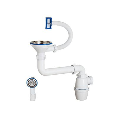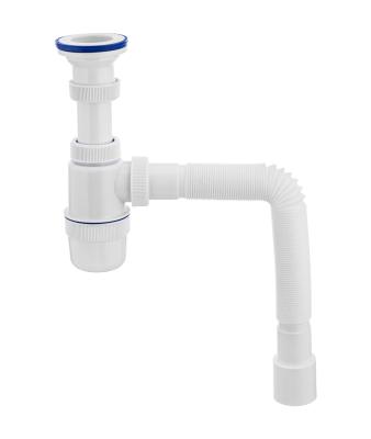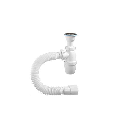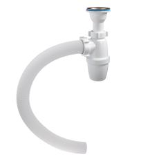 Сифон с малым корпусом и отстойником, литым выпуском с стальной чашкой диаметром 70 мм и отводом в канализацию гофрированным шлангом 40 мм.