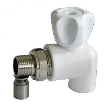 Шаровой кран с полипропиленовым корпусом, угловой. Применяется для подключения радиаторов к разводке из полипропиленовых труб. Позволяет перекрывать поток теплоносителя через отопительный прибор (основное назначение). Подключение крана к радиатору производится с помощью латунного никелированного полусгона, закрепленного на закладной детали накидной гайкой. Соединение с трубой – раструбной сваркой. Шаровой затвор и шток крана выполнены из латуни, затвор хромирован. Кран неремонтопригоден. Рабочая температура теплоносителя – до 90 °С, рабочее давление – до 10 бар.