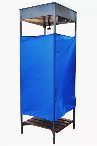 Каркас кабинки изготовлен из профильной трубы 30х30 мм.Бак покрыт специальной краской для лучшего нагрева от солнечной энергии. Внутри бак покрыт гальваническим цинковым покрытием, что предотвращает появление коррозии. Штора сшита из водостойкого материала и оснащена магнитной защелкой. Размер каркаса 800х800х2500, бака 800х800х200, толщина 1 мм, объем 128 л.