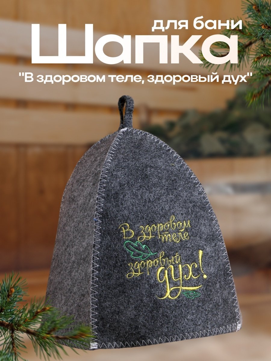 Шапка для бани и сауны с вышивкой В здоровом теле здоровый дух серая Добропаровъ