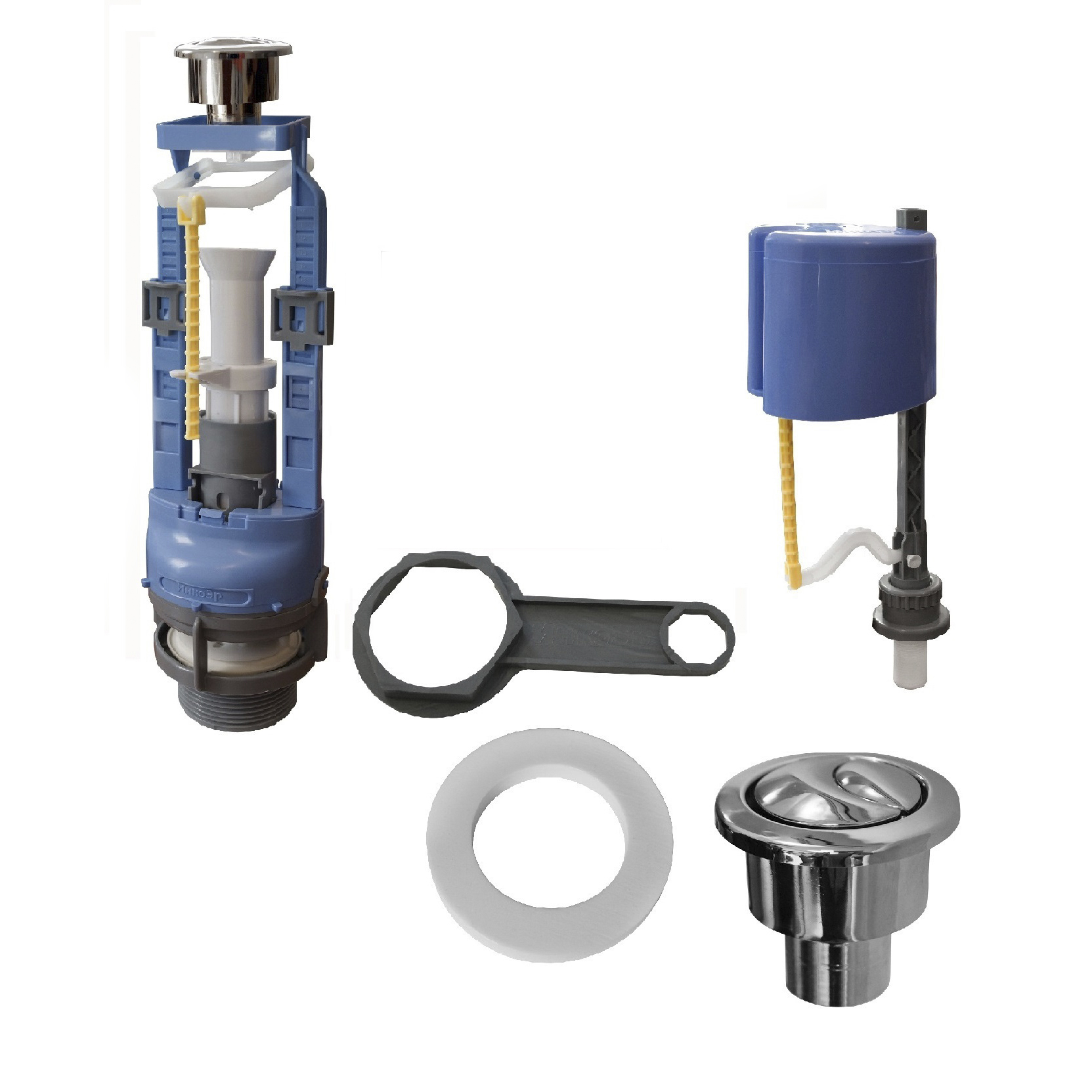 Устройство для автоматического наполнения водой унитазного бачка после того, как был осуществлен слив. Приспособление с двумя режимами слива позволяет экономно расходовать воду. Для слива полного объема бачка необходимо нажать на большую кнопку смыва, для смыва 50% содержимого бачка необходимо нажать малую кнопку смыва. Комплект арматуры для бачка к унитазу СБ2м DI оснащен функцией Стоп-Поток. Кнопка пуска имеет стильное современное гальваническое покрытие. Наполнительный клапан безотказно работает в загрязненной воде и при низком давлении. Величина малого смыва определяется заблаговременно настройками высоты положения поплавка блока регулировки малого смыва в сливном клапане. Сливной клапан СБ2 предназначен для использования в смывных бачках высотой от 350 до 430 мм и с диаметром отверстия в крышке бачка 40 мм. Наполнительный клапан НпрН - нижний клапан противодавления с диаметром штуцера 1/2".