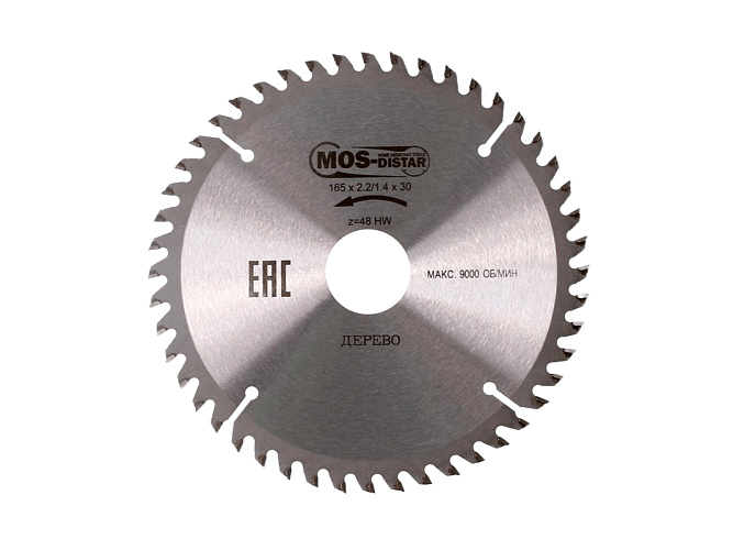 Диск пильный для циркулярных пил по ламинату (165x30 мм; 48 зубьев; кольцо 30/20 мм) MOS-DISTAR применяется для работы с ламинированной ДСП, паркетной доской, МДФ, фанерой, с комбинированными столярными плитами.