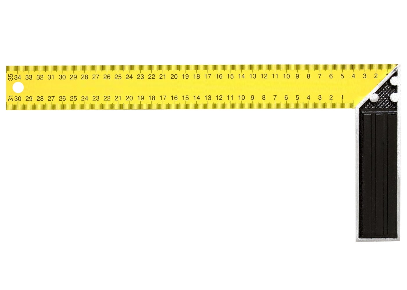 Столярный угольник состоит из двух основных элементов – рукояти и измерительной линейки. Использует метрическая систему, деления нанесены по трем сторонам. Линейка изготовлена из инструментальной стали, а ручка-основание из алюминиевого сплава.