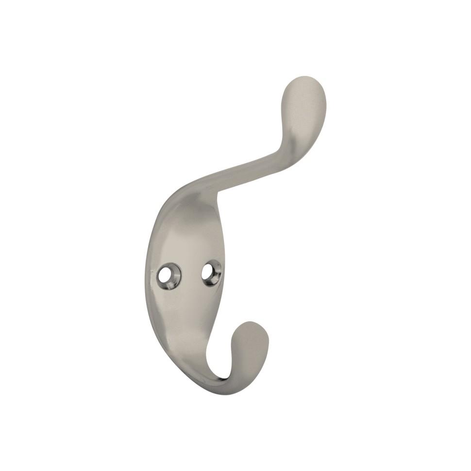 Крючок двухрожковый настенный MB-K-005 бренда AJAX предназначен для подвешивания одежды и предметов обихода. Подходит для всех типов стен и любого интерьера. Крепится к несущей деревянной поверхности при помощи саморезов, для монтажа на иные поверхности необходимо использовать дюбели. Рекомендованная предельная нагрузка на крючок MB-K-005 до 10 килограммов. Выполнен из цинкового сплава (ZAMAK) с гальваническим покрытием. Допускается эксплуатация во влажной среде. Упаковка: цветной пакет. Цвет: мат.никель.Комплектация: крючок - 1 шт, саморезы - 2 шт., дюбели в комплект не входят.