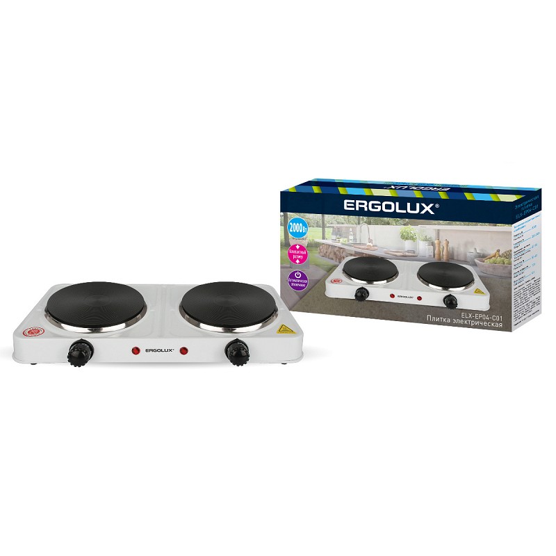Плитка электрическая 2 конфорки 2кВт диск белая ERGOLUX ELX-EP04-C01