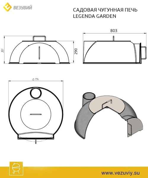 Комплектация: чугунная купольная печь Везувий Легенда Гарден, заслонка с задвижкой и деревянной ручкой, дымоход из нержавеющей стали, с шибером и зонтиком
