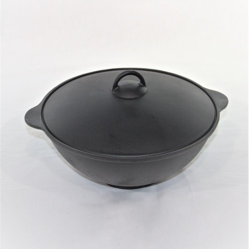 Казан чугунный чаша азиатская объёмом 12 литров с алюминиевой крышкой прекрасно подходит для приготовления блюд на открытом огне или углях. Плоское дно позволяет приготовить плов, как на открытом огне, так и в домашних условиях на электрической или газовой плите.