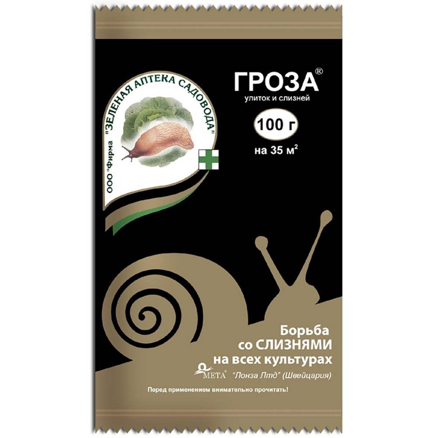 Гроза, гранулы (60 г/кг метальдегида) - моллюскоцид для борьбы со слизнями на овощных, ягодных, плодовых, цветочных, цитрусовых, винограде. Препарат разбрасывается сплошным рассевом по всей площади. Расход препарата – 15 г на 5 кв.м.