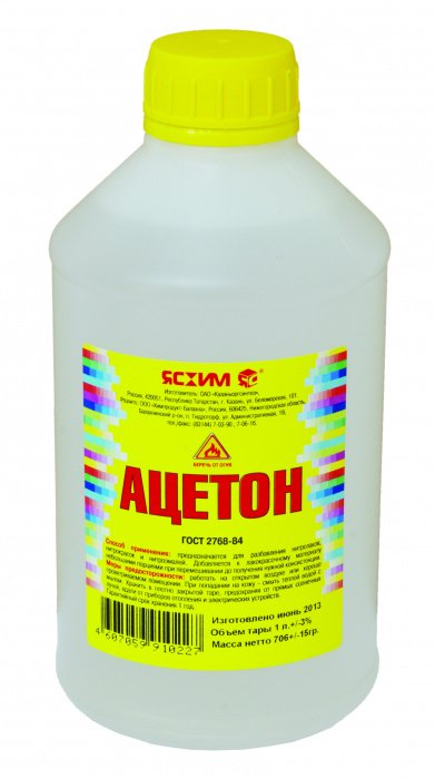 Высококачественный ацетон Ясхим. Для растворения лаков, красок, эмалей, природных смол, масел, полистирола, эпоксидных смол, полиакрилатов хлоркаучуков. ГОСТ 2768-84.
