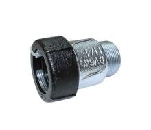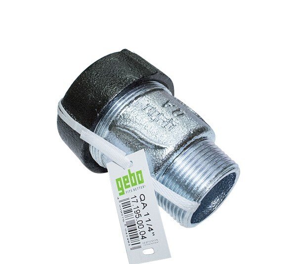 Обжимные цанговые соединения изготовлены из ковкого оцинкованного чугуна для стальных труб (1 1/4" дюйма) наружный диаметр трубы в диапазоне 40,0 - 42,9 мм с переходом на 1 1/4" дюйма с внешней резьбой.