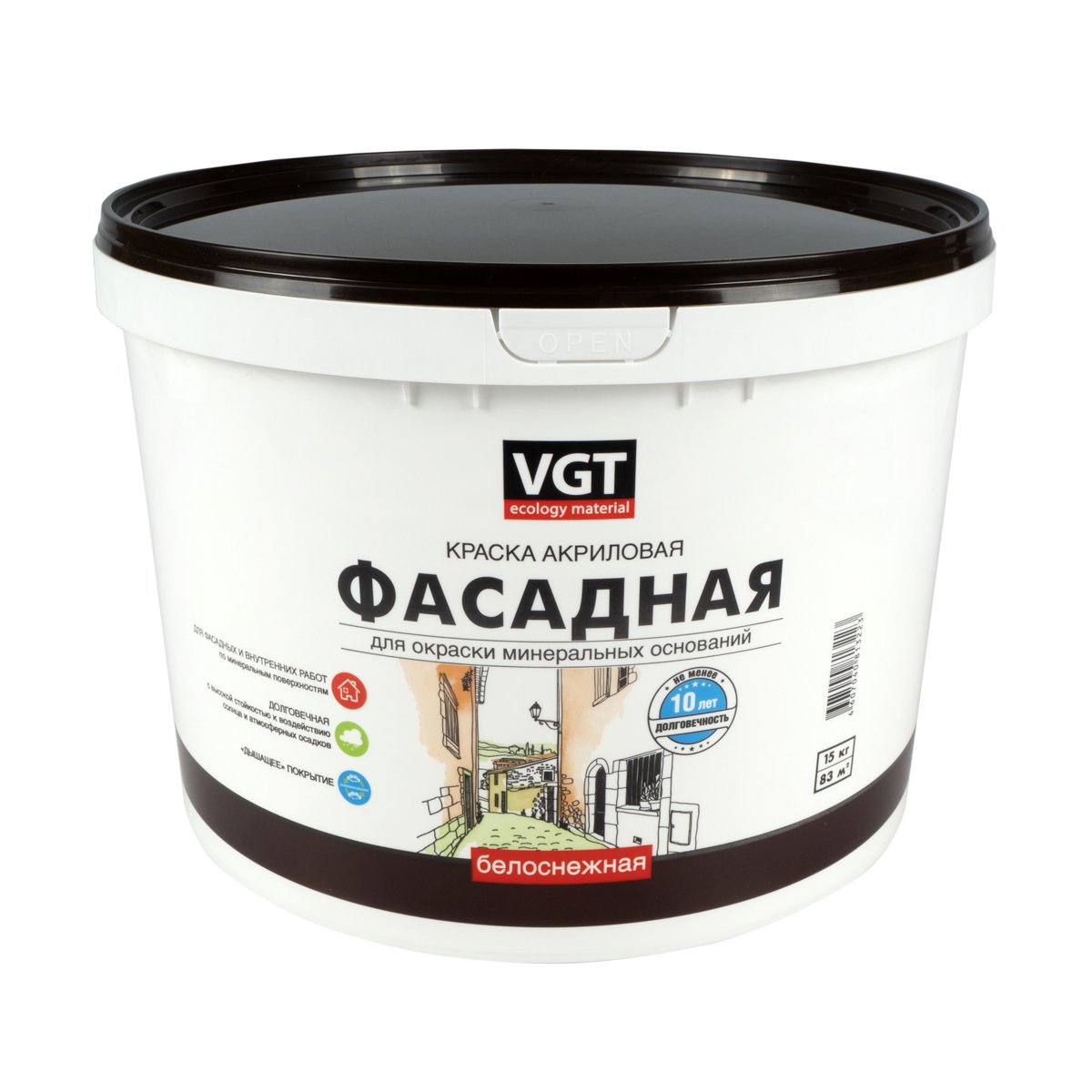 Краска фасадная VGT ВД-АК-1180 белоснежная используется для окраски фасадов и для внутренних работ во влажных помещениях. Представляет собой белую, вязкую, маслянистую на ощупь жидкость. Сухой остаток не менее 55%. После высыхания образует ровную матовую поверхность с белизной не менее 90%.