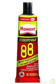 "Момент 88" - это теплостойкий, универсальный, водостойкий клей, предназначенный для склеивания резины, кожи, металлов, полистирола, оргстекла, пластиков, пробки, стекла, керамики, бетона.