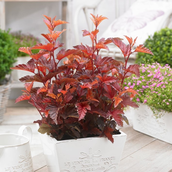 Пузыреплодник калинолистный Amber Jubilee. Плотный куст с многочисленными прямыми побегами, образующими густую, полушаровидную крону высотой до 2м и шириной до 1,5 м. У Эмбер Джубили листья 3–5–лопастные , до 7 см, гофрированные по жилкам, вытянутые. Колористика листвы постоянно меняется – от оттенков желтого через оранжевые, до лаймовых, а осенью листья становятся фиолетовыми. Цветы многочисленные, белые, собраны в полушаровидные соцветия, размером до 5 см. Плоды – сборные (вздутые листовки), красно–лиловые. Цветёт в июне–июле. Высаживать пузыреплодник Эмбер Джубили лучше на солнечных пространствах, но он будет развиваться и в полутени, и в тени. Но свою яркую окраску сохраняет только на солнечных местах, а в тенистых – зеленеет. Растет на любых, в меру увлажненных и хорошо дренированных почвах. Уход за Amber Jubilee заключается в периодических поливах, подкормках, рыхлении почвы, формирующей и санитарной обрезке. Морозостоек. Устойчив к болезням и вредителям.